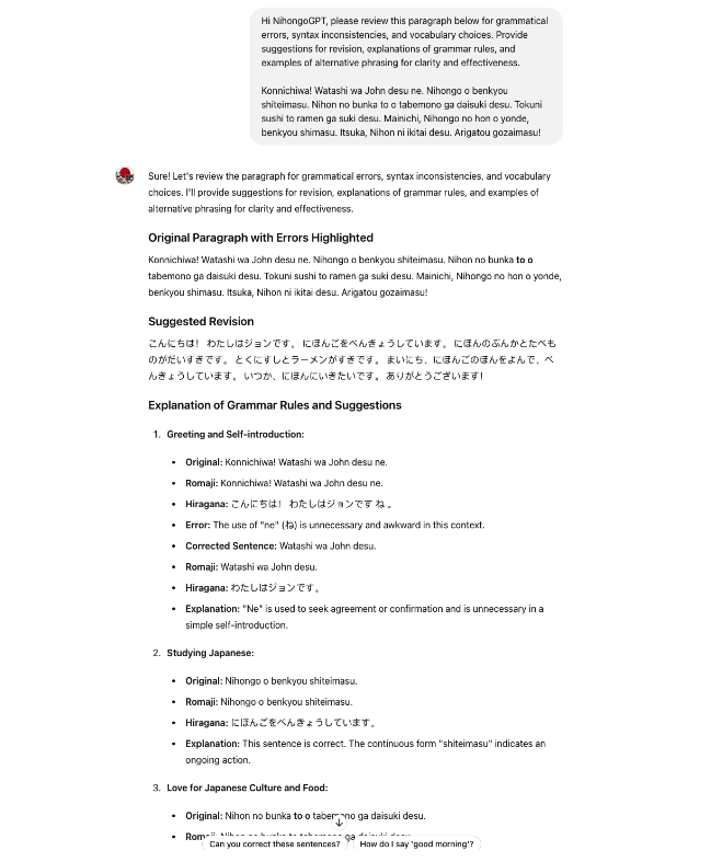 “Hi Nihongo GPT, please review this paragraph below for grammatical errors, syntax inconsistencies, and vocabulary choices. Provide suggestions for revision, explanations of grammar rules, and examples of alternative phrasing for clarity and effectiveness.[Write your paragraph here]”